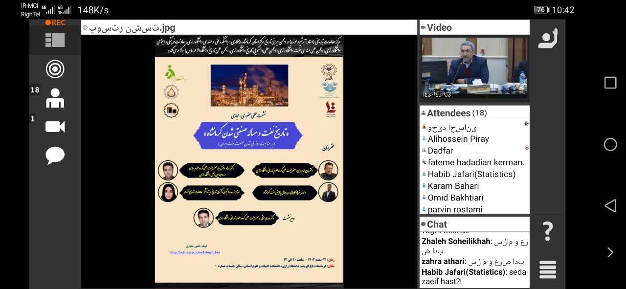 مرکز مطالعات تاریخی (اسناد، آرشیو و موزه) و انجمن ایرانی تاریخ مرکز استان کرمانشاه با همکاری: دانشکده فنی و مهندسی دانشگاه رازی، معاونت فرهنگی و اجتماعی دانشگاه رازی، انجمن علمی مهندسی نفت دانشگاه رازی، انجمن علمی دانشجویی تاریخ دانشگاه رازی، انجمن علمی تاریخ دانشگاه الزهرا (س) در تاریخ 21 اسفند 1402، در دانشگاه رازی، دانشکده ادبیات و علوم انسانی؛ نشست حضوری – مجازی با عنوان: «تاریخ نفت و مسأله صنعتی شدن کرمانشاه» را با حضور: دکتر روح اله بهرامی، عضو هیئت علمی گروه علوم تاریخی دانشگاه رازی، دکتر فرهاد دانش نیا، عضو هیئت علمی گروه علوم سیاسی و روابط بين الملل دانشگاه رازی، مهندس فرهاد کاویانی، مدیر عامل پالایش نفت کرمانشاه و فرشته ازره، دانشجوی دکتری تاریخ و پژوهشگر مطالعات تاریخ نفت برگزار کرد. دبیر این نشست هم دکتر مهدی عزتی، عضو هیئت علمی گروه علوم تاریخی دانشگاه رازی بودند. ایشان در ابتدا پس از معرفی سخنرانان مقدمه ای را در خصوص اهمیت نفت و مسئله صنعتی شدن نفت در کرمانشاه بیان کردند، سپس از سخنرانان نشست دعوت نمودند که مباحث خویش را ارائه نمایند.