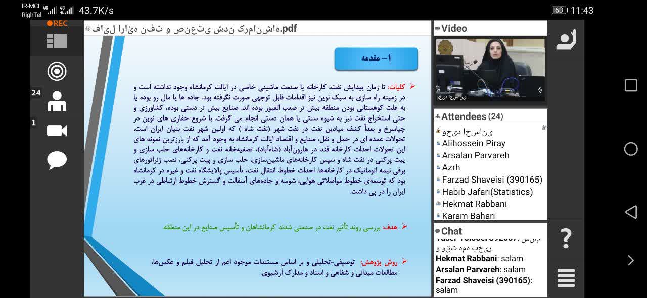 در این قسمت فرشته ازره پژوهشگر تاریخ نفت و دانشجوی دکتری تاریخ ایران اسلامی راجع به تحقیقاتی که در این حوزه انجام دادند صحبت نمودند. در ابتدا ایشان ضمن تشکر از جناب آقای دکتر روح اله بهرامی و معاونت پژوهشی دانشگاه رازی، به تاریخچه صنعت نفت در کرمانشاه با تکیه بر اسناد و منابع تاریخی پرداختند و اقدامات انجام شده در این خصوص و دستاوردهای پژوهشی خویش در باره نفت کرمانشاه را شرح دادند. در ادامه به حفر نخستین چاه نفت در ایران یعنی چیاسرخ در کرمانشاه اشاره کردند و امکانات موجود در آنجا و نیز ابزار آلات حفاری و استخراج نفت کرمانشاه در عصر قاجار را شرح دادند. همچنین ایشان ضمن اشاره به روند تاسیس موسسات نفتی در کرمانشاه و اقدامات شرکت نفت ایران و انگلیس با شکل گیری ابعاد اجتماعی، اقتصادی و فرهنگی و مدنی شهر نفتی نفت شهر و شکل گیری اعتصابات کارگری اشاره کردند. سپس به تاسیس صنایع جانبی نفت نظیر صنعت بری، کارخانه های حلب سازی، ماشین سازی دستگاه های نفت، مونتاژ، یخ سازی برای کارکنان شرکت نفت و تصفیه خانه نفت در کرمانشاه را بیان کردند. ایشان در پایان سخنان خود به تاریخ نفت شهر در حوزه کشف و استخراج نفت پرداختند که این شهر در زمان گذشته شهری مدرن محسوب می شده را شهری نفت بنیان دانستند و در پایان حمایت از پژوهش ها و مطالعات حوزه نفت و صنعت را خواستار شدند.